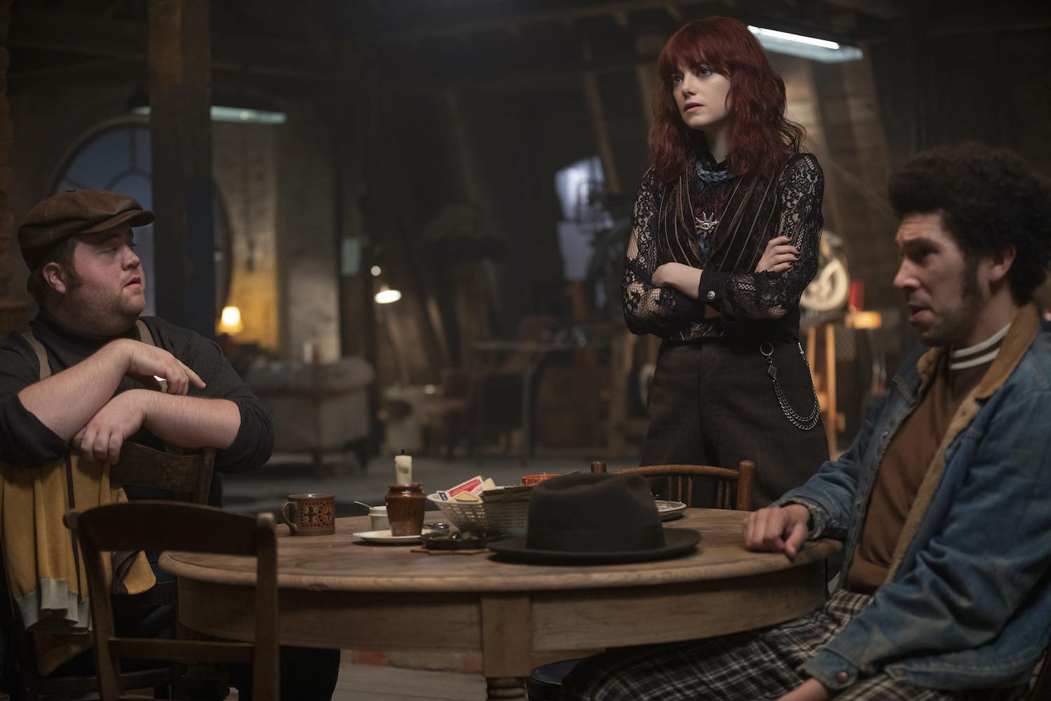 (L-R): Paul Walter Hauser as Horace, Emma Stone as Estella and Joel Fry as Jasper in Disney’s live-action CRUELLA. Photo by Laurie Sparham. © 2021 Disney Enterprises Inc. All Rights Reserved.
