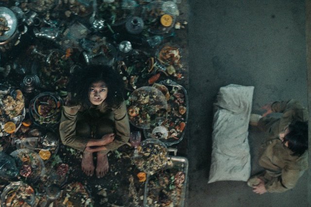 The Platform never shies away from the horrors that something like The Pit would produce; there’s rampant violence, madness, and plenty of cannibalism as those stuck in this system try to get by. We learn that some of them are there voluntarily, like Goreng, who accepted a stint in The Pit in exchange for a degree upon his release, while others have been sentenced there for various crimes. Either way, they are all a part of the same uncaring system that assigns them a level seemingly at random.