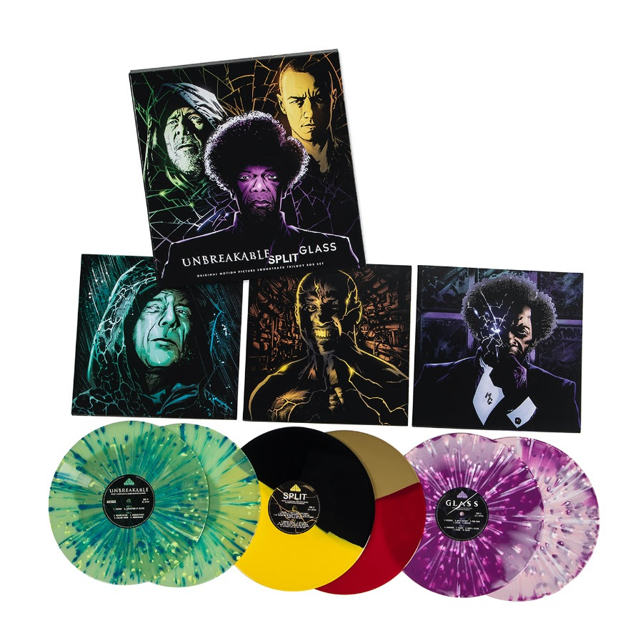 The 6 LP set features the film scores from Unbreakable (composed by James Newton Howard), and Split and Glass (composed by West Dylan Thordson). Each album is spread across two 180-gram colored vinyl records, with an art print and “heavyweight, old-style tip-on gatefold jackets with satin coating.” The entire package is housed in a box with art by Jonas Scharf, with colors by Dennis Calero.